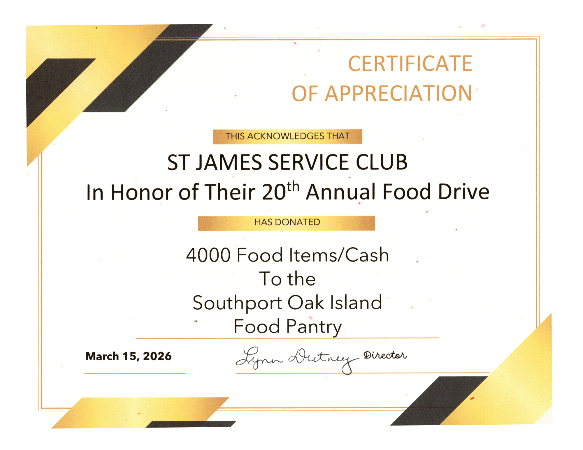 The Southport Oak Island Interchurch Fellowship (SOIICF) Food Pantry extends a big thank you to the Service Club for exceeding their 4,000-item goal during the 20th anniversary of the February food drive. This milestone was made possible by the incredible generosity of the St. James community!